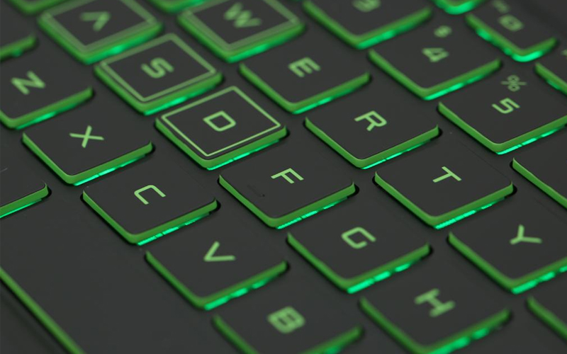HP Pav Gaming có thiết kế bàn phím với LED RGB xanh bao trùm toàn bàn phím vừa đem lại vẻ ngoài đẹp mắt, ấn tượng, vừa hỗ trợ sử dụng ở nhũng nơi có ánh sang yếu. Sử dụng thực tế cho thấy cảm giác phím khá tốt, thao tác thoải mái với phím nhấn êm với quãng di chuyển ngắn, khoảng cách giữa các phím hợp lý nên phù hợp cả người dùng có cỡ tay lớn.