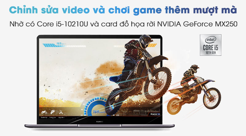 HUAWEI MateBook 13 sở hữu bộ xử lý Intel Core i5-10210U thế hệ thứ 10 và card đồ họa rời NVIDIA GeForce MX250, giúp chỉnh sửa video và chơi game thêm mượt mà, nhanh chóng và đáng tin cậy.