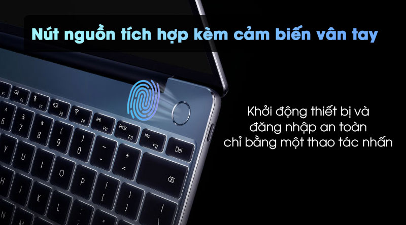 Nút nguồn kết hợp với cảm biến vân tay của HUAWEI MateBook 13 cho phép bạn bật nguồn và nhanh chóng đăng nhập chỉ trong một bước, vừa an toàn, lại nhanh chóng, tiết kiệm thời gian.