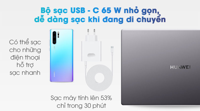 MateBook D 15 có kèm theo bộ sạc USB Type-C tiện lợi, tích hợp khả năng sạc nhanh. Máy tính có thể sạc lên 53% chỉ trong khoảng 30 phút (theo hãng công bố) giúp bạn không lo gián đoạn công việc.