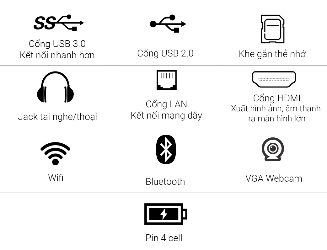 Máy trang bị đầy đủ các cổng kết nối, trong đó có cổng HDMI để trình chiếu lên màn hình lớn như tivi hoặc máy chiếu.