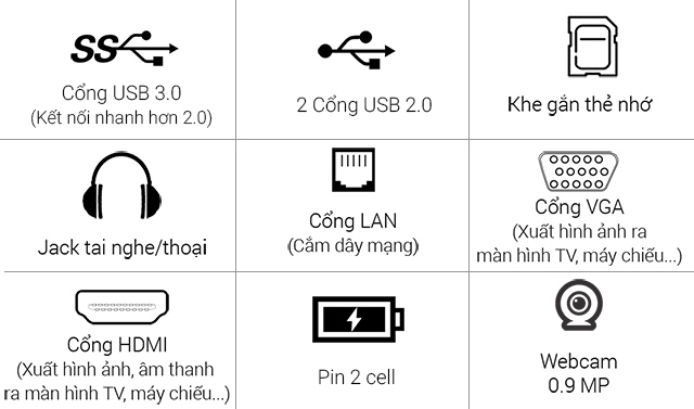 Máy trang bị đầy đủ các cổng kết nối, trong đó có cổng HDMI để trình chiếu lên màn hình lớn như tivi hoặc máy chiếu.