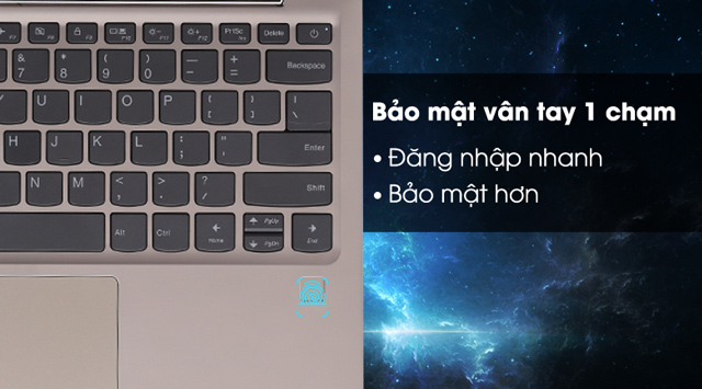 Ngay kế bên chuột cảm ứng có một ô vuông nhỏ, đây chính là cảm biến vân tay của Lenovo IdeaPad 720S. Và với chức năng Windows Hello được tích hợp trên Windows 10 bản quyền của máy thì người dùng càng dễ cài đặt và dễ sử dụng bảo mật vân tay hơn nữa.