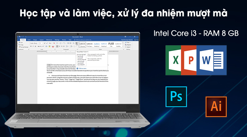 Đi cùng là RAM 8 GB đa nhiệm mượt mà, ổn định. Nhìn chung, cấu hình này sử dụng được các ứng dụng học tập, văn phòng phổ biến, lướt web, giải trí,...