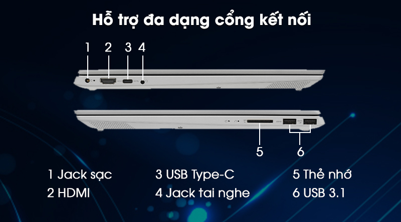 Laptop có các cổng giao tiếp phổ biến: USB 3.1, HDMI, USB Type-C tiện lợi kết nối với tivi, điện thoại, máy chiếu,...