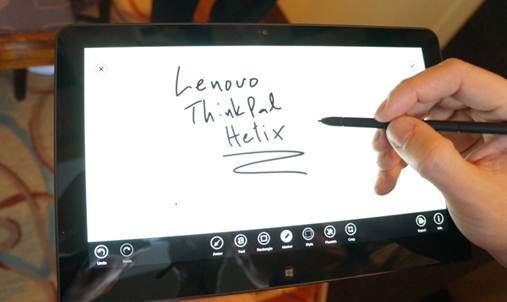 Giao diện của Windows 8 rất thông minh với các biểu tượng là những mảng lớn giúp thao tác nhanh chóng trên màn hình cảm ứng. Ngoài ra Lenovo ThinkPad Helix còn trang bị một bút cảm ứng cho người dùng viết vẽ thoải mái lên màn hình của máy. Cảm giác trải nghiệm Windows 8 trên một thiết bị như ThinkPad Helix thật tuyệt vời.