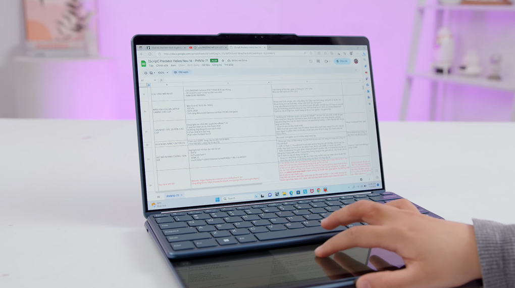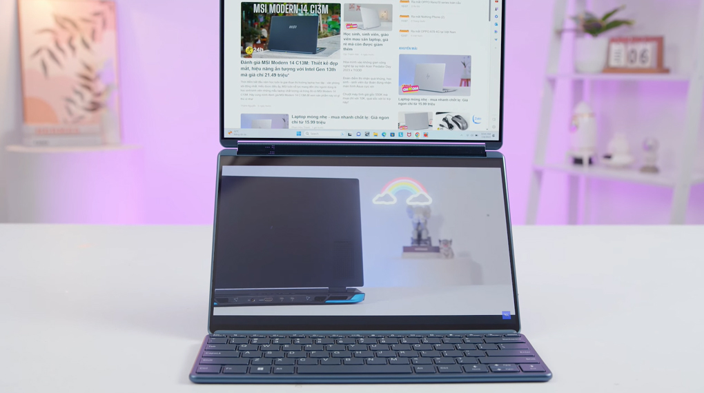 Đặc biệt, phần tổng thể và bản mặt A khi gập lại không khác gì những chiếc laptop mỏng nhẹ thông thường nhưng độc đáo là ở phần chiếc màn hình kép và hoàn toàn không có bàn phím. Nhờ khả năng gập 360 độ, mình cũng sử dụng laptop dưới nhiều cách khác nhau như dựng thẳng lên để sử dụng, quay dọc và setup giống 1 cuốn sách hay gập hẳn lại để dùng như 1 chiếc tablet,... Tính linh động được áp dụng như vậy cũng nhờ phần bản lề được thiết kế chắc chắn. Thêm vào đó, dải loa được bố trí chạy dọc theo sau phần bản lề cũng làm mình rất ấn tượng bởi cách sắp xếp linh kiện và bố trí quá hợp lý của hãng.