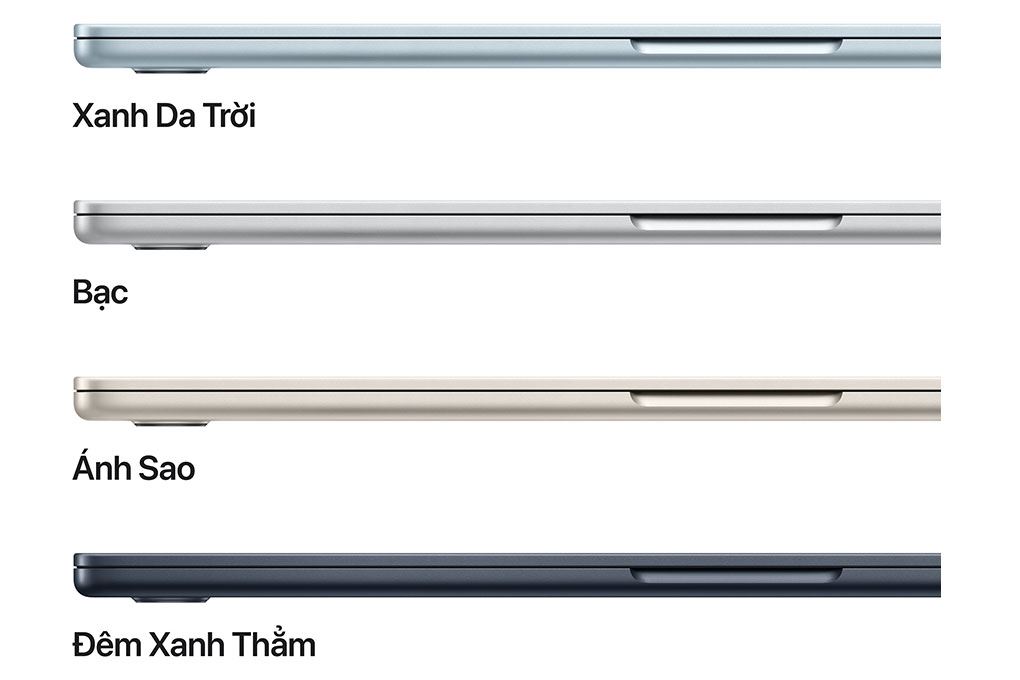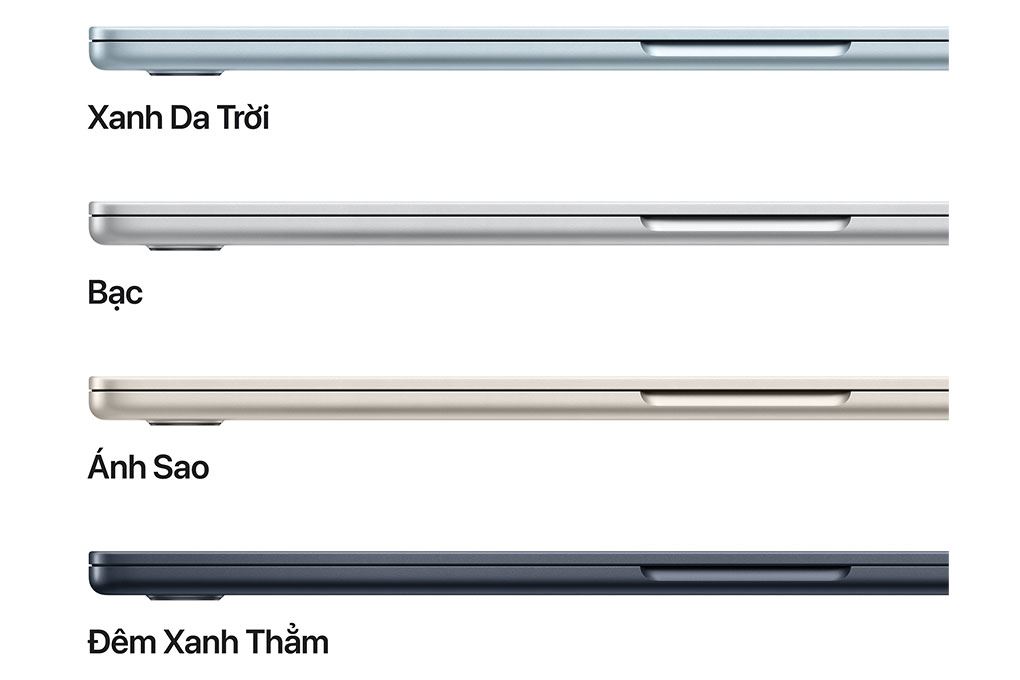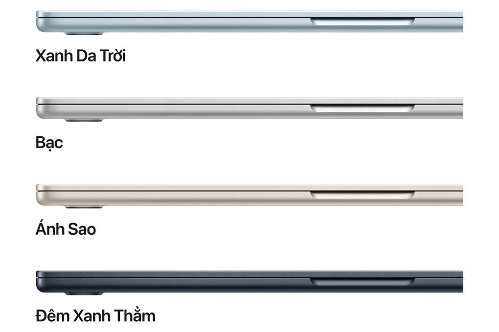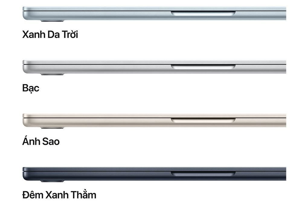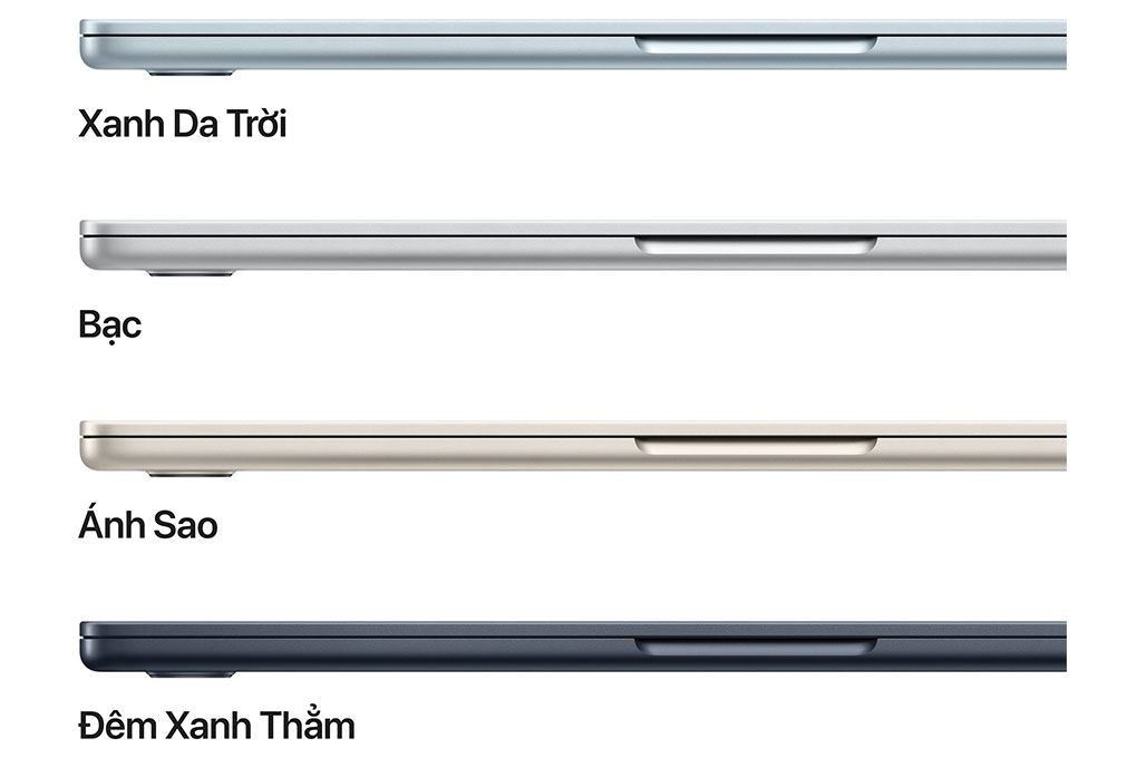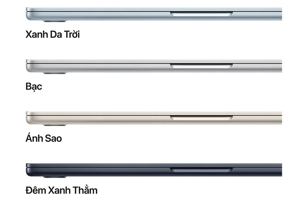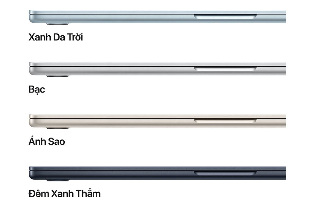 MacBook Air với chip M5 15 inch được Apple giới thiệu với 4 tùy chọn màu sắc hiện đại, gồm Sky Blue (Xanh da trời), Midnight (Đêm xanh thẳm), Starlight (Ánh sao) và Silver (Bạc). Những gam màu này không chỉ mang lại vẻ ngoài sang trọng, tinh tế mà còn phù hợp với nhiều phong cách người dùng khác nhau, từ trẻ trung, năng động đến tối giản và chuyên nghiệp.