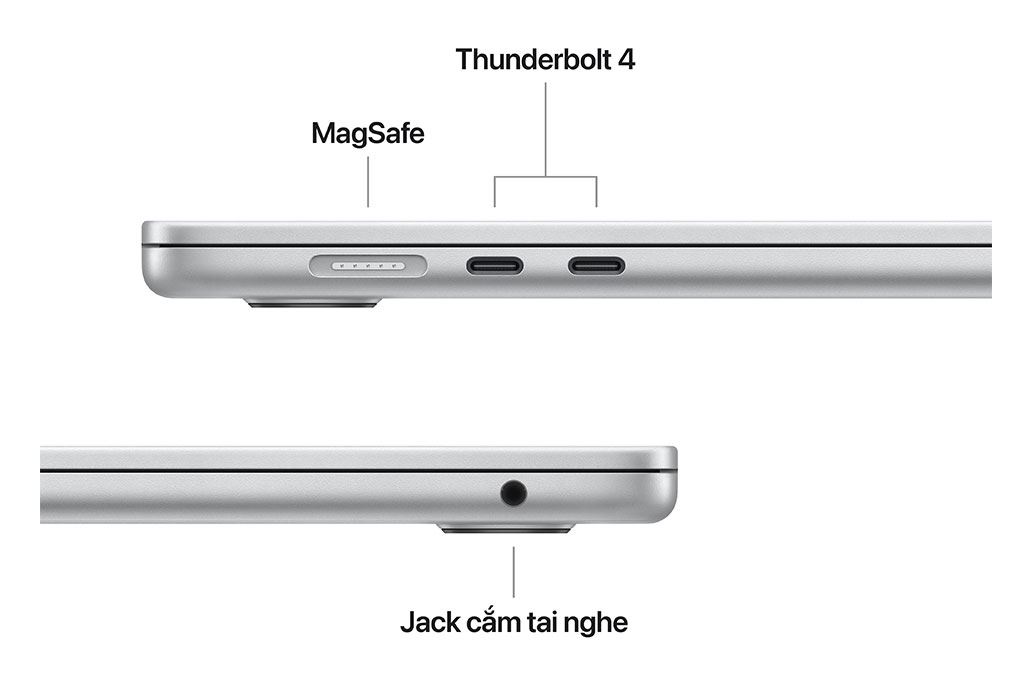 MacBook Air với chip M5 15 inch được trang bị hệ thống sạc và kết nối hiện đại, đáp ứng tốt nhu cầu làm việc và giải trí. Máy tích hợp cổng sạc MagSafe 3 giúp sạc nhanh, an toàn khi dễ dàng tách ra nếu bị vướng dây. Bên cạnh đó là hai cổng Thunderbolt 4 (USB-C) hỗ trợ sạc, xuất hình DisplayPort, truyền dữ liệu tốc độ cao lên đến 40 Gb/s và tương thích chuẩn USB 4, cùng jack tai nghe 3.5 mm tiện lợi cho việc nghe nhạc hoặc họp trực tuyến.