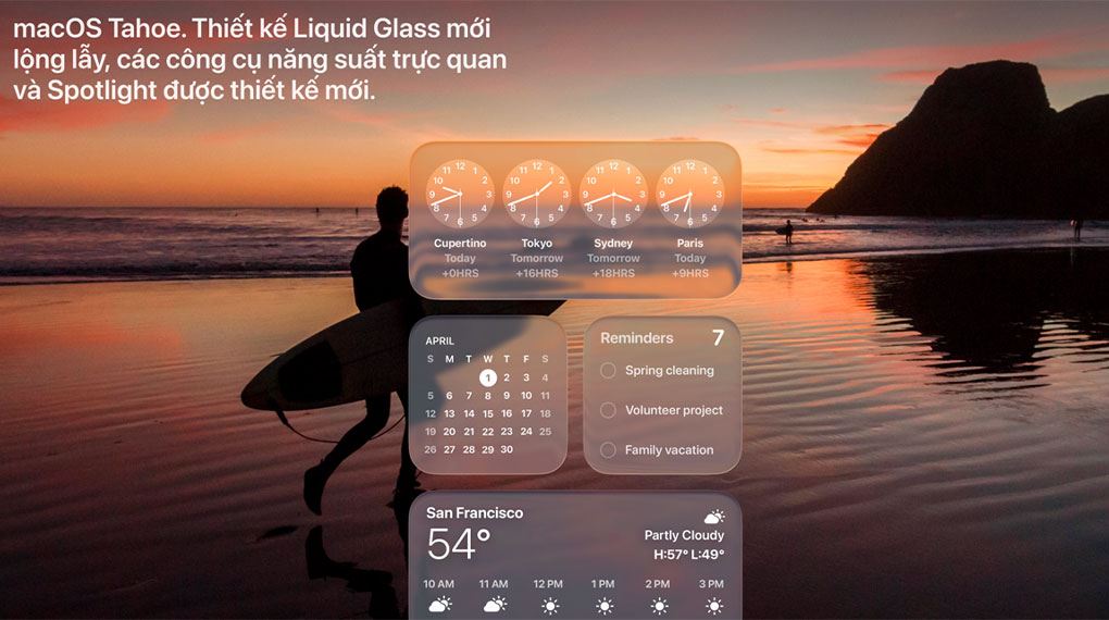 Trên macOS Tahoe, trải nghiệm MacBook Pro được nâng cấp mạnh mẽ nhờ sự hỗ trợ của Apple Intelligence. Hệ thống AI này giúp người dùng tìm kiếm nhanh hơn với Spotlight, hỗ trợ tác vụ thông minh trong Phím Tắt và cung cấp tính năng Dịch Trực Tiếp trong Tin Nhắn, FaceTime và ứng dụng Điện Thoại. Bên cạnh đó, macOS Tahoe còn mang đến giao diện Liquid Glass mới hiện đại cùng các tính năng thông suốt với iPhone, giúp làm việc hiệu quả hơn nhưng vẫn đảm bảo quyền riêng tư và bảo mật dữ liệu.