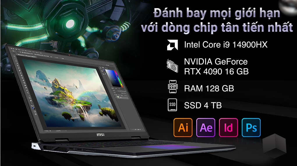 Con chip Intel Core i9 Raptor Lake 14900HX thuộc thế hệ mới nhất nhà Intel kết hợp với card rời NVIDIA GeForce RTX 4090 16 GB cho người dùng khả năng tự do thực hiện bất cứ hoạt động nào trên máy, hiệu chỉnh các tựa game đồ hoạ AAA lên max setting để trải nghiệm hay vận dụng các phần mềm thiết kế đồ hoạ, After Effects, cắt ghép khối hình 3D thật chuyên nghiệp hệt như một dạng studio thu nhỏ.