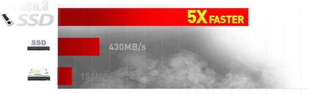 Mang trong mình công nghệ PCI-E Gen 3.0 (ổ cứng dạng thanh) có tốc độ nhanh gấp 5 lần ổ cứng thể rắn (SSD) thông thường, song song đó máy có tới 4 khe cắm ổ cứng cho người dùng thoải mái truy xuất dữ liệu tốc độ cao mà không lo hết dung lượng.
