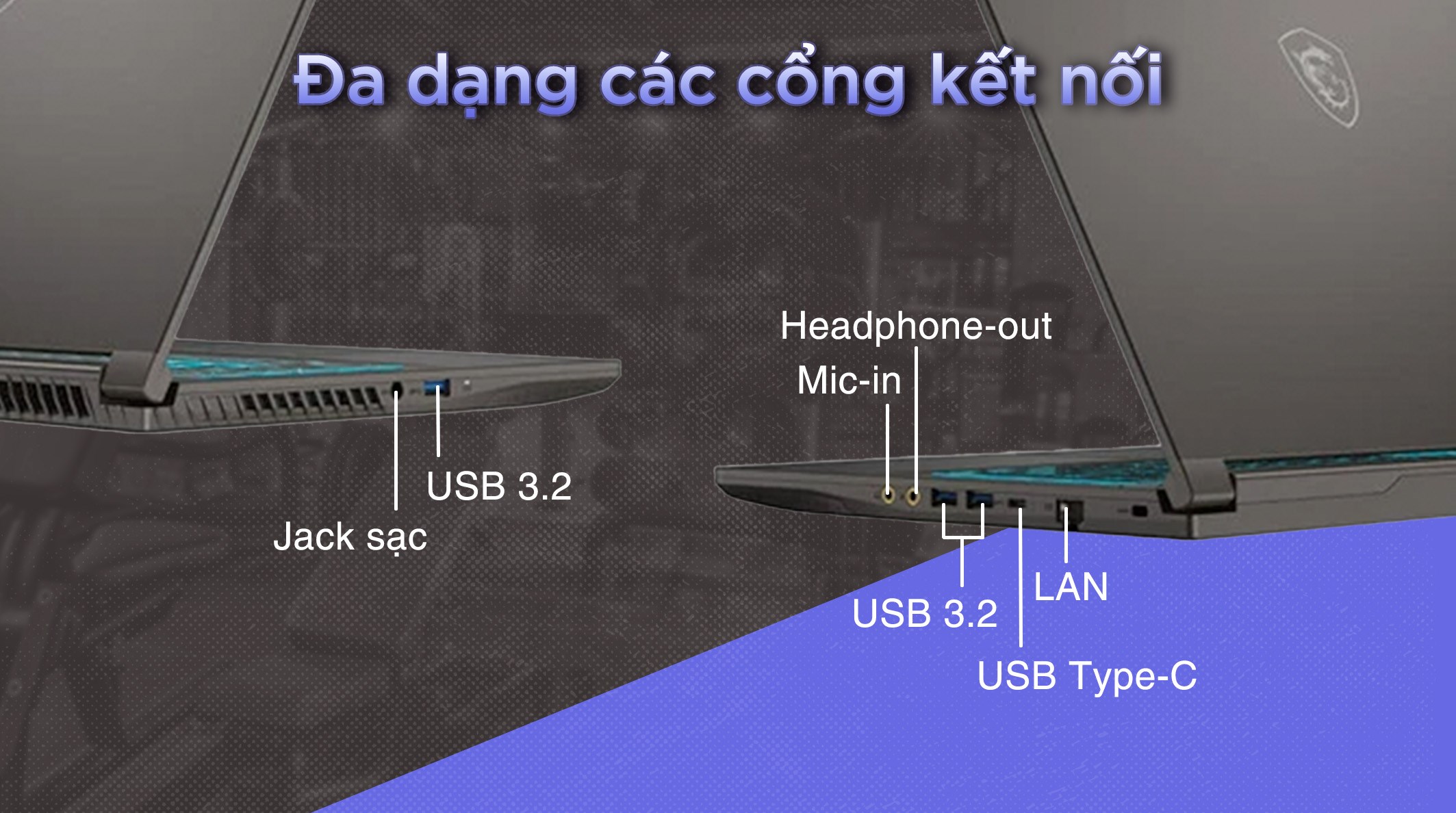Laptop MSI hỗ trợ nhiều cổng kết nối như LAN, Mic-in, Headphone-out, USB 3.2, HDMI, USB Type-C, cho phép người dùng dễ dàng kết nối với các thiết bị ngoại vi, màn hình ngoài hoặc ổ cứng di động. Kết nối không dây Wi-Fi 6E (802.11ax) và Bluetooth 5.3 giúp bạn dễ dàng kết nối với internet và các thiết bị ngoại vi. Pin 3-cell Li-ion 52.4 Wh cho thời lượng sử dụng tương đối ổn định.