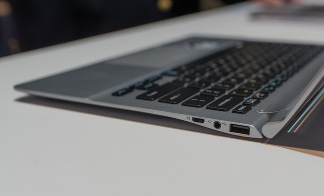 Cổng USB 3.0, mini HDMI và jack tai nghe. Nút nguồn được đặt trên thanh gập màn hình của máy, có thiết kế khá là nhỏ gọn