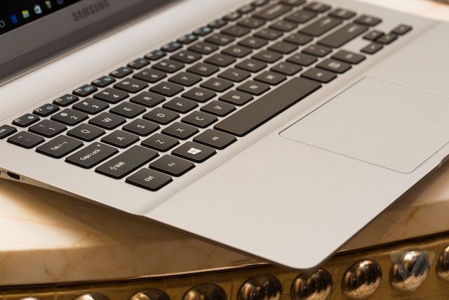 Cận cảnh bàn phím và trackpad của Notebook 9. Bàn phím QWERTY dạng full-sized, touchpad lớn
