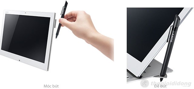 Bút cảm ứng số được giữ gọn trên tay bởi phần móc của bút và đế bút được tích hợp ngay trên thân máy VAIO Duo 13. Đế bút được gắn hợp lý trên thân máy để giữ cho chiếc bút thẳng đứng khi bạn chưa sử dụng đến, có thể đẩy để bút ẩn vào trong thân máy khi không cần sử dụng đến nó.