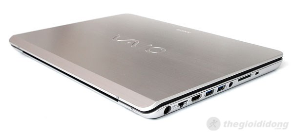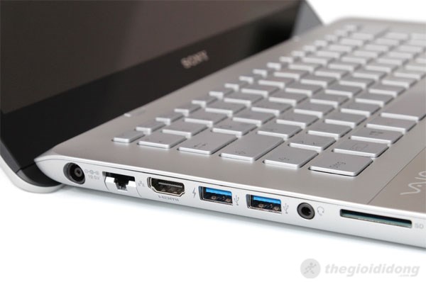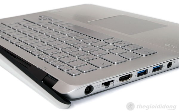 Do thân máy Vaio Fit 14 cũng khá mỏng thế nên các cổng kết nối cũng được trang bị hạn chế về số lượng. Trên thiết bị có 2 cổng USB 3.0, cổng HDMI giúp bạn dễ dàng kết nối một cách nhanh chóng với màn hình lớn hơn, từ cổng này bạn có thể dùng cáp chuyển đổi để có thể dùng cổng VGA.