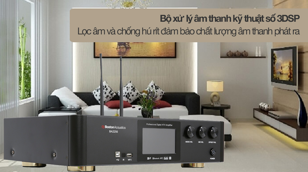 Trang bị bộ xử lý âm thanh kỹ thuật số 3DSP với khả năng lọc âm tốt, chống hú rít giúp bạn thoả thích nghe nhạc, xem phim với chất âm trung thực, sống động và mạnh mẽ. Bên cạnh đó, bộ vi xử lý này còn giúp điều khiển âm thanh, tiếng Echo, Reverb chính xác và chi tiết hơn, âm thanh tươi sáng, không bị gắt.