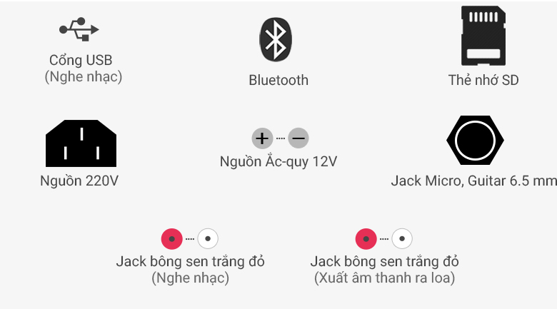 Bạn có thể kết nối loa kéo với tivi, laptop, điện thoại... qua bluetooth, riêng tivi còn có thể kết nối bằng jạck hoa sen trắng đỏ. Ngoài ra, loa còn phát dữ liệu âm thanh trực tiếp qua thẻ nhớ SD, USB.