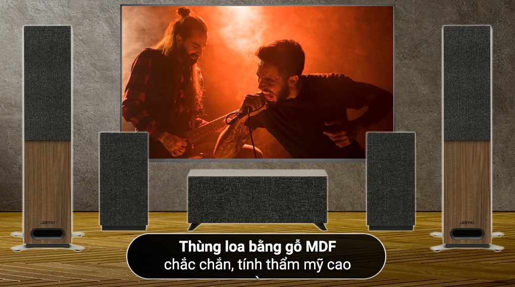 - Dàn âm thanh Jamo chất lượng hoàn thiện tốt với thùng loa bằng gỗ MDF vân tự nhiên, kiểu dáng nhỏ gọn, hiện đại và sang trọng, chống bám bụi tốt, bền bỉ, đồng thời hỗ trợ âm thanh phát ra ổn định, lôi cuốn hơn.