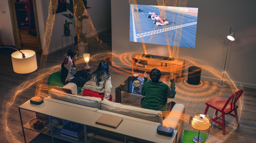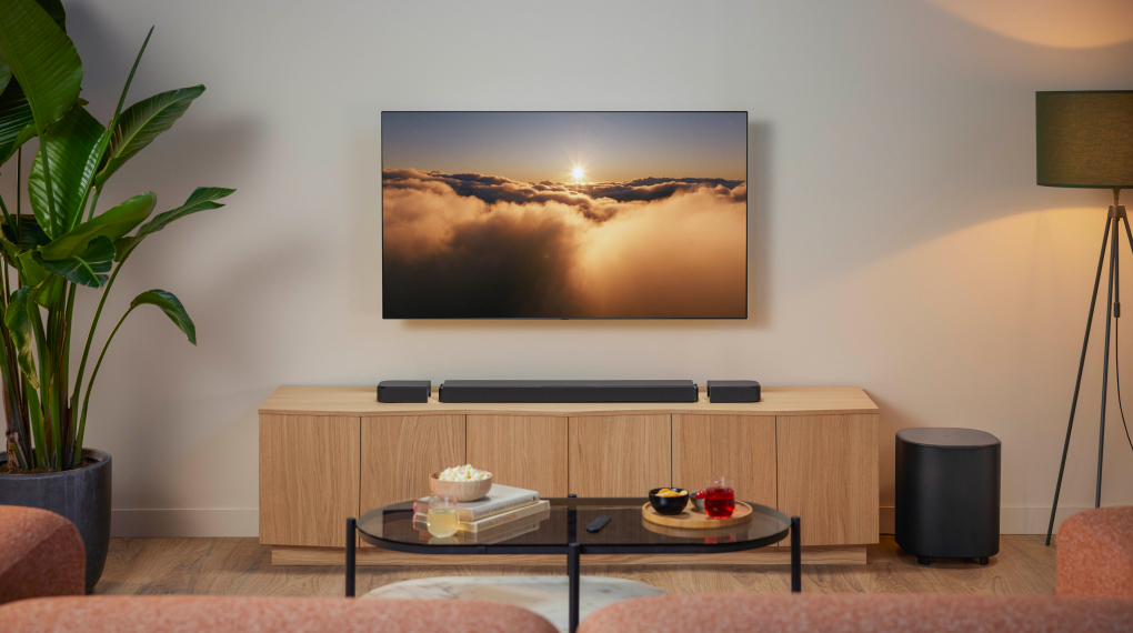 Soundbar công suất 400W đảm nhiệm dải trung - cao rõ lớp, còn loa sub 300W tái tạo bass sâu chắc. Khi thêm hai loa surround tháo rời, âm thanh được mở rộng từ phía sau, tạo cảm giác bao quanh rõ hơn.