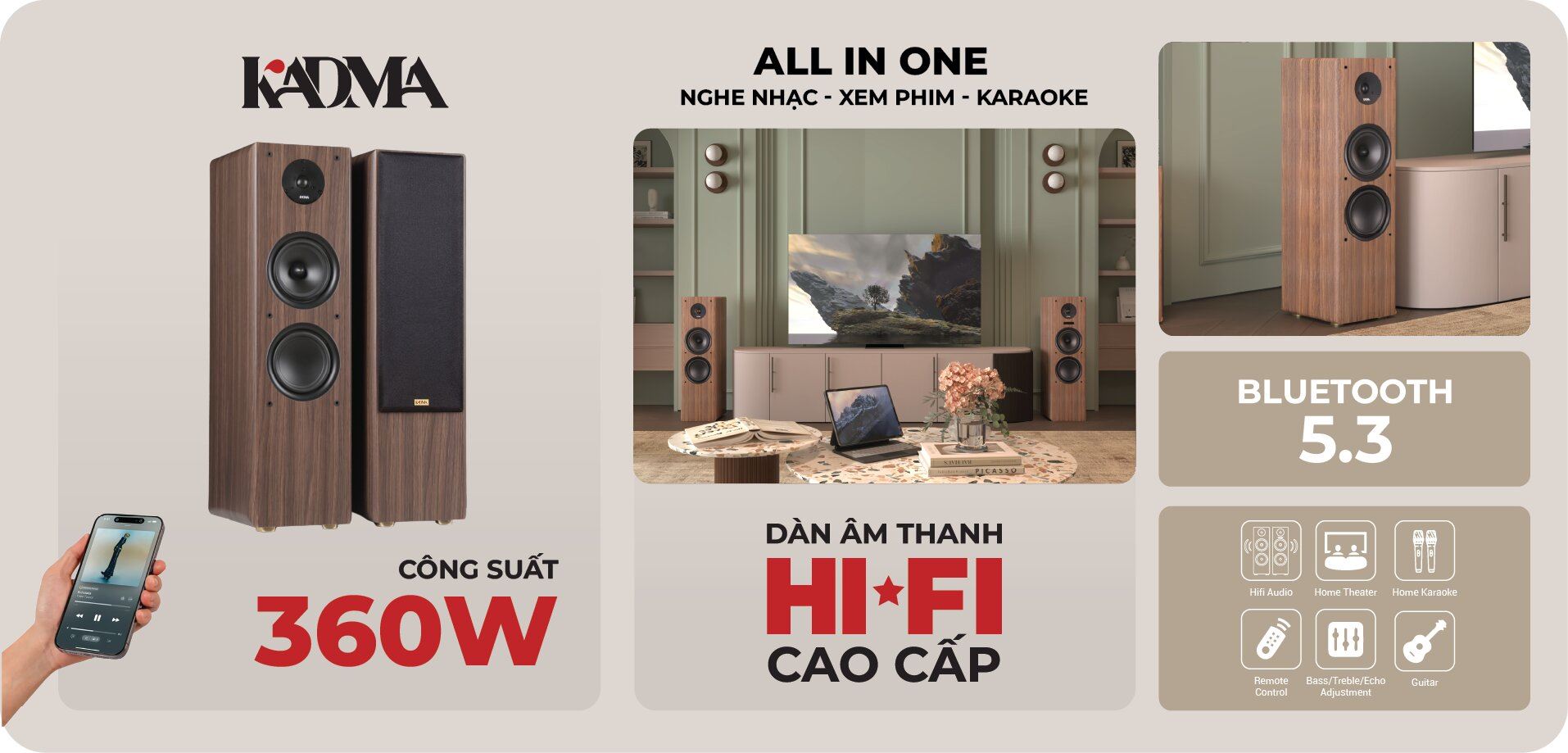 KADMA BS66 với tổng công suất mạnh mẽ lên đến 360W, đáp ứng tốt nhu cầu giải trí trong các không gian từ 20 đến 30 m². Âm thanh phát ra rõ ràng, có lực và phủ đều khắp phòng, phù hợp cho cả nghe nhạc lẫn hát karaoke.