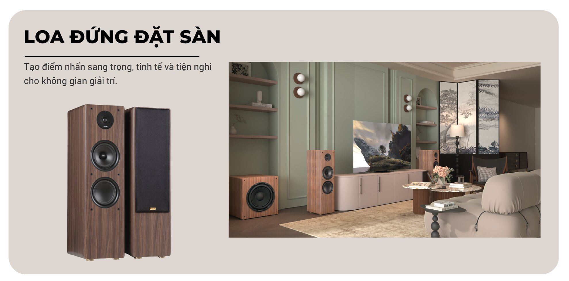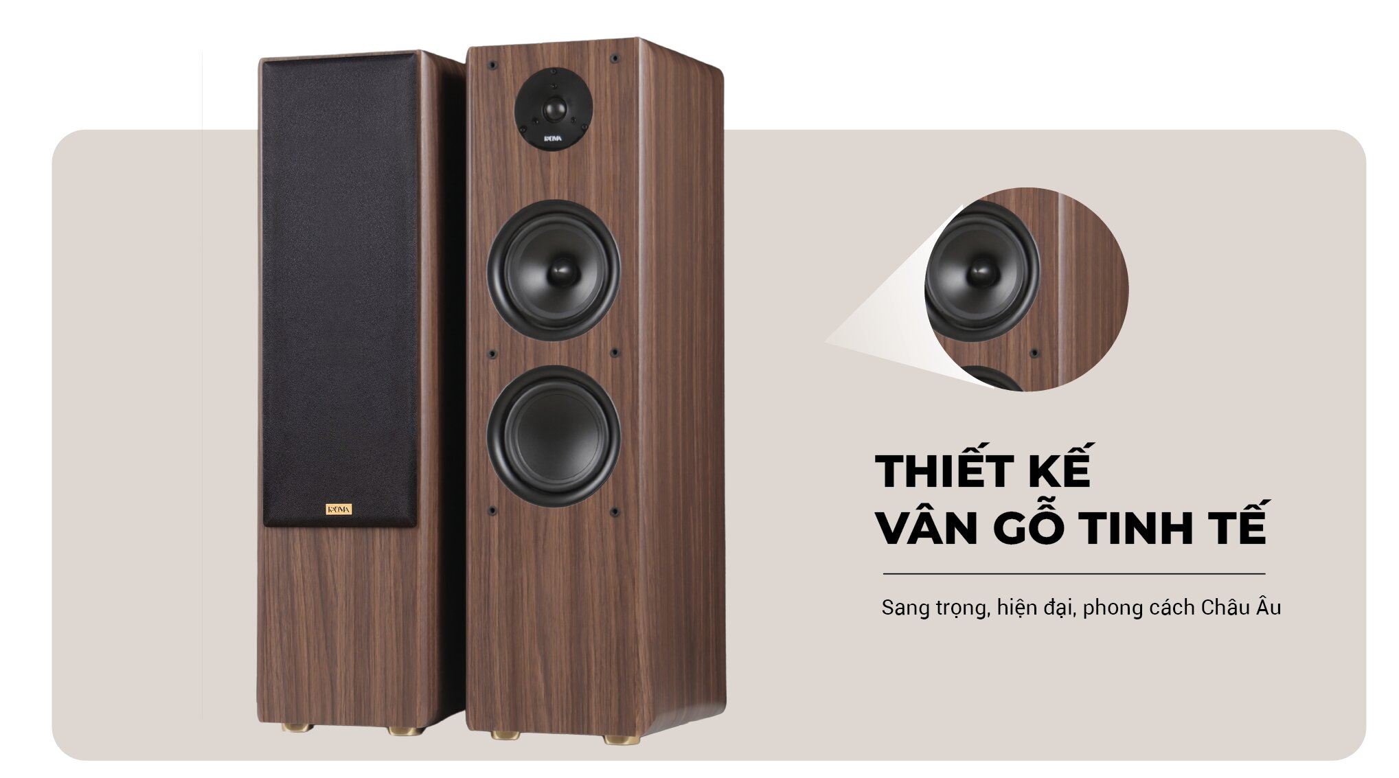 Bộ sản phẩm KADMA BS66 bao gồm hai loa đứng đi kèm hai micro không dây cùng phụ kiện hỗ trợ, giúp người dùng yên tâm hơn trong quá trình ca hát và trình diễn. Loa sở hữu phong cách Châu Âu hiện đại, với tông màu gỗ walnut sang trọng cùng lưới vải tinh tế, dễ dàng hòa mình vào mọi không gian nội thất, từ phòng khách hiện đại đến phòng giải trí cổ điển.