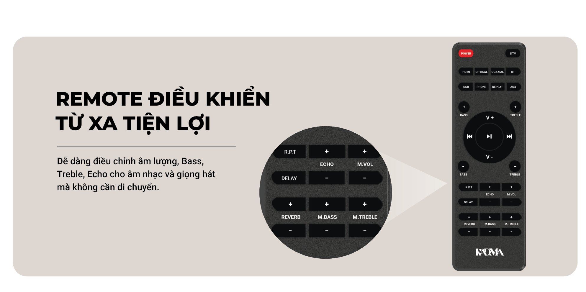 Việc điều khiển KADMA BS66 trở nên dễ dàng hơn bao giờ hết với hệ thống phím nhấn trực quan ngay trên loa và remote điều khiển từ xa đi kèm. Bạn có thể dễ dàng điều chỉnh nguồn, phát/dừng nhạc, chuyển bài, tăng/giảm âm lượng nhạc và micro.