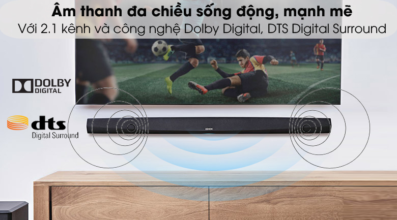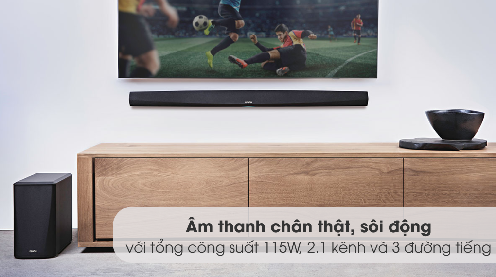 Bộ loa Soundbar Denon S516 nâng tầm không gian sống với thiết kế tinh giản mà sang trọng, không gian âm thanh cuốn hút với công suất 115W, hệ thống 2.1 kênh, 3 đường tiếng cùng một số công nghệ âm thanh như Dolby Digital tạo âm thanh đa chiều, DTS Digital Surround hay Linear PCM âm thanh phát ra chân thực cho trải nghiệm thực tế, kết nối không dây và điều khiển từ xa bằng điện thoại tiện lợi.
