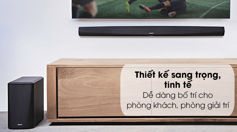 - Bộ loa Soundbar Denon S516 bao gồm 1 loa thanh ngang hình chữ nhật và 1 loa Subwoofer không dây, bố trí hài hòa với mọi không gian nội thất của phòng khách, phòng ngủ cũng như phòng làm việc, phòng hội nghị,…