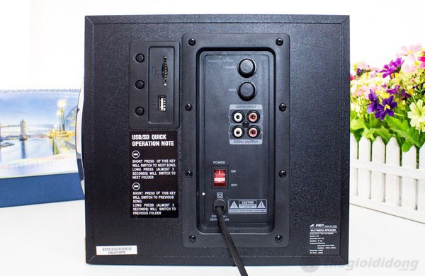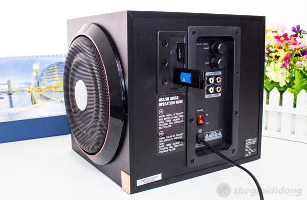 Tất cả các khe cắm, núm chỉnh và cổng âm thanh đều được bố trí ở mặt bên của thùng loa. Chúng ta có 1 khe thẻ nhớ, 1 khe USB, núm chỉnh volume, núm chỉnh âm bass, cổng âm thanh input/output. Cổng âm thanh trên A333U chỉ hỗ trợ đầu cắm 5 mm (còn gọi là đầu cắm 2RCA hay đầu cắm bông sen).