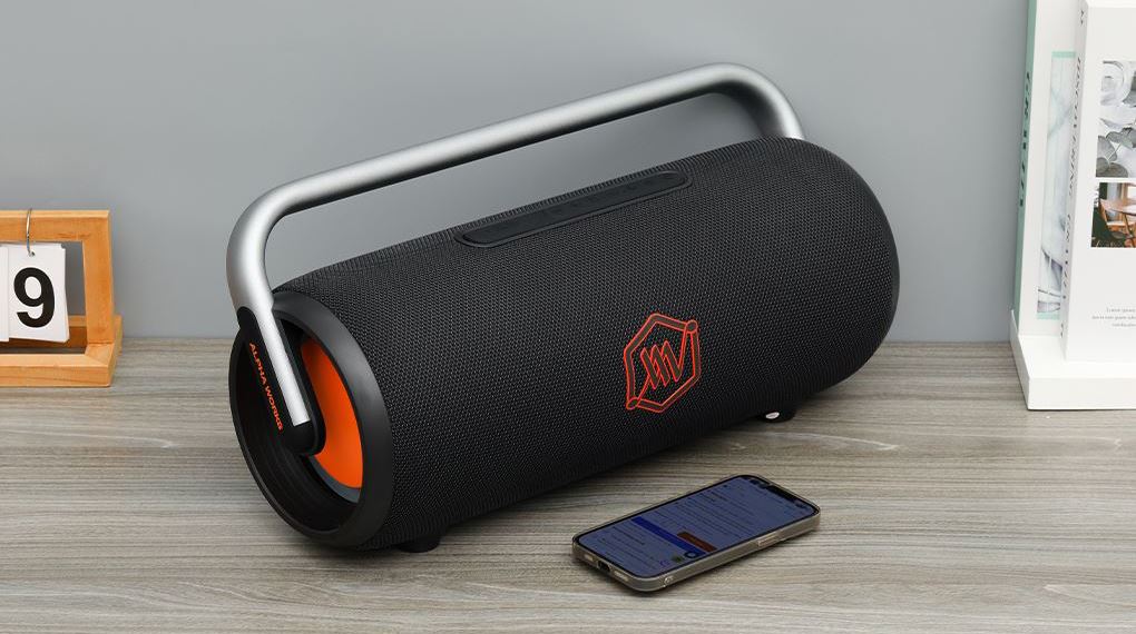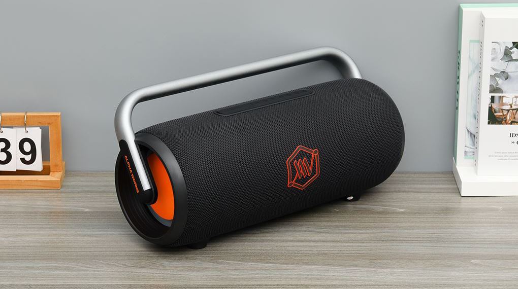 Nổi bật ở trung tâm là logo Alpha Works được khắc tinh xảo với sắc đỏ cam nổi bật, tăng thêm điểm nhấn nhận diện thương hiệu. Tay cầm được thiết kế liền khối, uốn cong mềm mại tạo nên vẻ ngoài cứng cáp nhưng không kém phần thanh lịch, đồng thời giúp bạn dễ dàng mang theo ở bất kỳ đâu. Với kích thước 48.5 cm ngang, 19 cm sâu, 23.3 cm cao và khối lượng 5.37 kg, chiếc loa đạt được sự cân đối giữa độ gọn gàng và độ bền chắc.