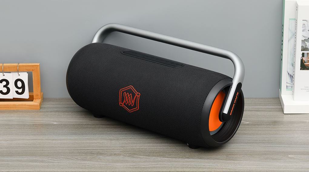 Loa Bluetooth được chế tác với kiểu dáng hiện đại, mang phong cách mạnh mẽ nhưng vẫn giữ được sự tinh tế trong từng đường nét. Thân loa được bao bọc bởi lớp vải cao cấp màu đen, tạo cảm giác chắc chắn và sang trọng, đồng thời giúp bảo vệ loa khỏi trầy xước hay bụi bẩn trong quá trình sử dụng.