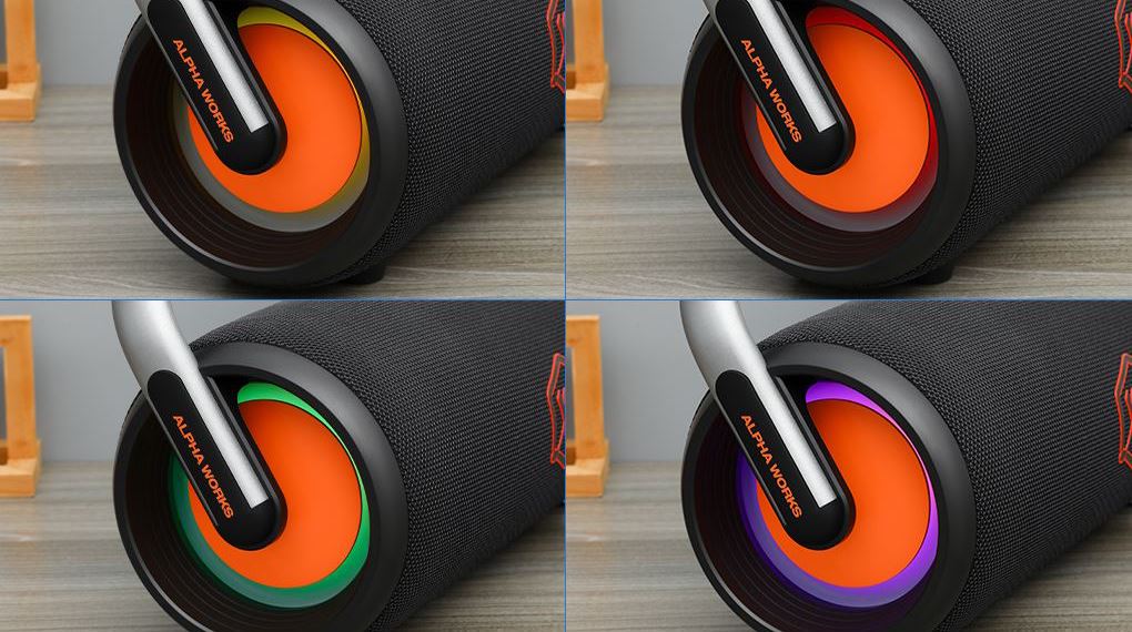 Hệ thống đèn RGB đa sắc được bố trí tinh tế, có thể thay đổi màu sắc theo nhịp điệu âm nhạc, mang lại không gian ánh sáng sống động và đầy cảm xúc. Đặc biệt, loa còn có thể sạc dự phòng cho điện thoại hoặc thiết bị khác thông qua cổng USB tiện ích – một điểm cộng lớn cho những chuyến đi xa.