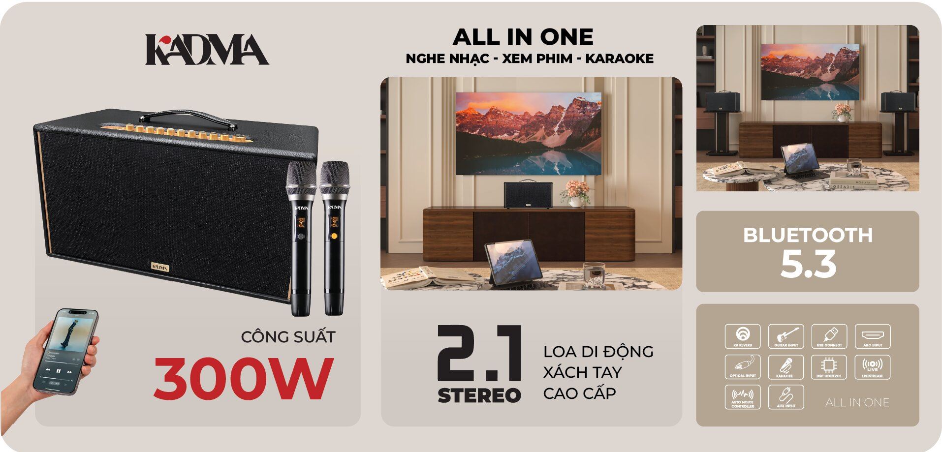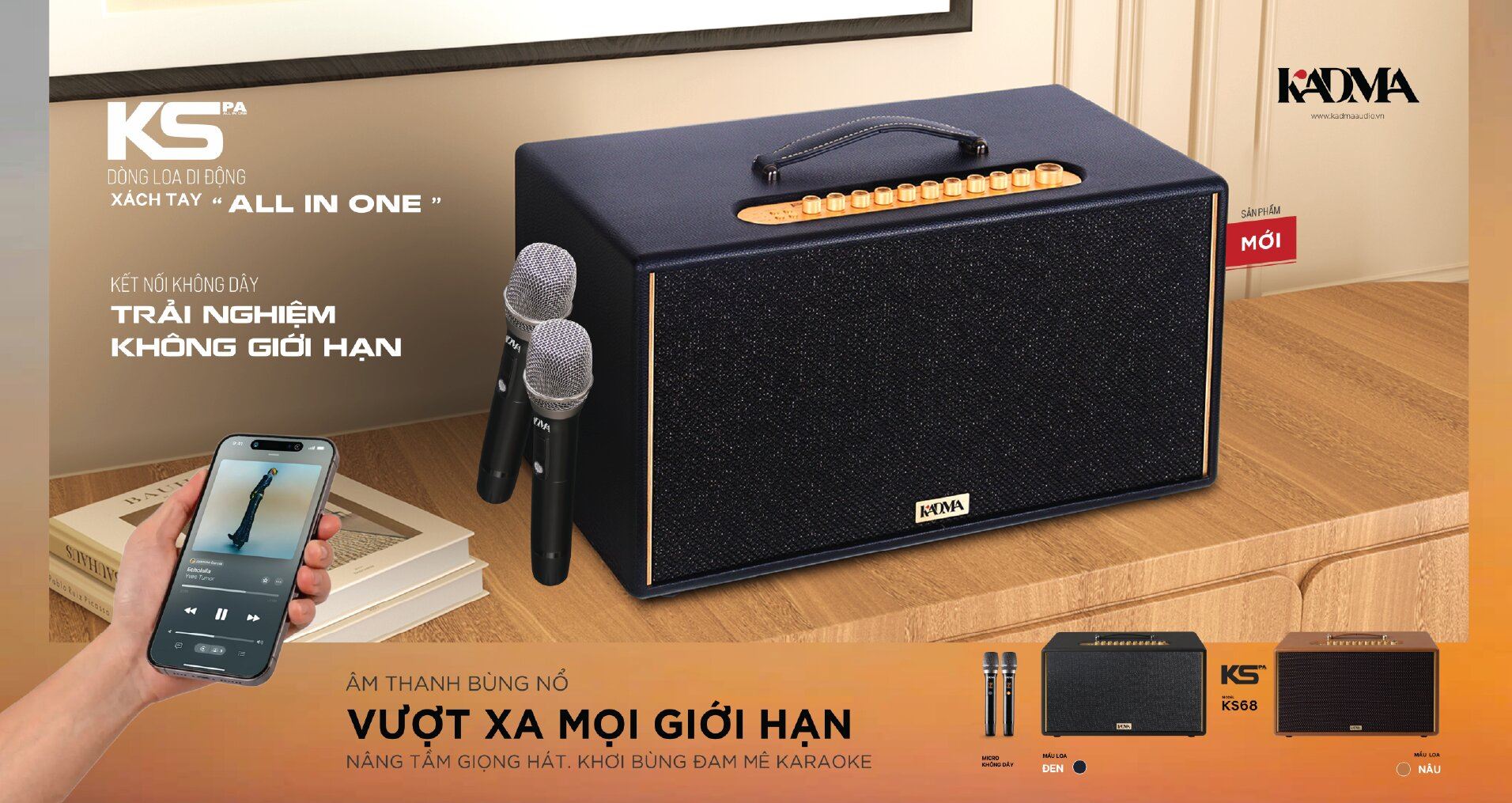 KADMA được thành lập 2023, là thương hiệu âm thanh Việt Nam tiên phong giải pháp "All In One" – kết hợp loa Hi-Fi Active nghe nhạc và Karaoke trong một thiết kế vân gỗ sang trọng. Với công nghệ mạch Class D và chống hú rít độc quyền được tối ưu bởi kỹ sư Âu - Việt, KADMA cam kết mang lại trải nghiệm âm thanh hiệu suất cao, chuẩn mực và tinh tế.