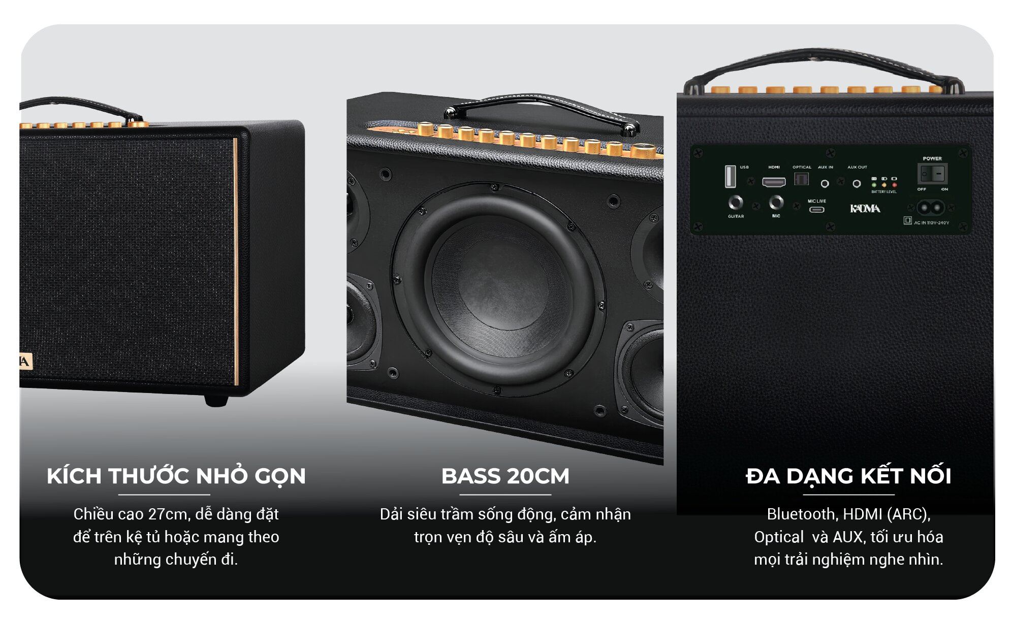 Với tổng công suất lên đến 300W và hệ thống 2.1 kênh cùng 3 đường tiếng, KADMA KM-KS68 mang đến trải nghiệm âm thanh sống động, mạnh mẽ. Dù bạn tổ chức bữa tiệc nhỏ trong nhà hay buổi dã ngoại ngoài trời, chiếc loa này đều có thể lấp đầy không gian bằng những giai điệu sôi động, trầm bổng rõ ràng, đảm bảo không gian âm nhạc luôn tràn đầy năng lượng.