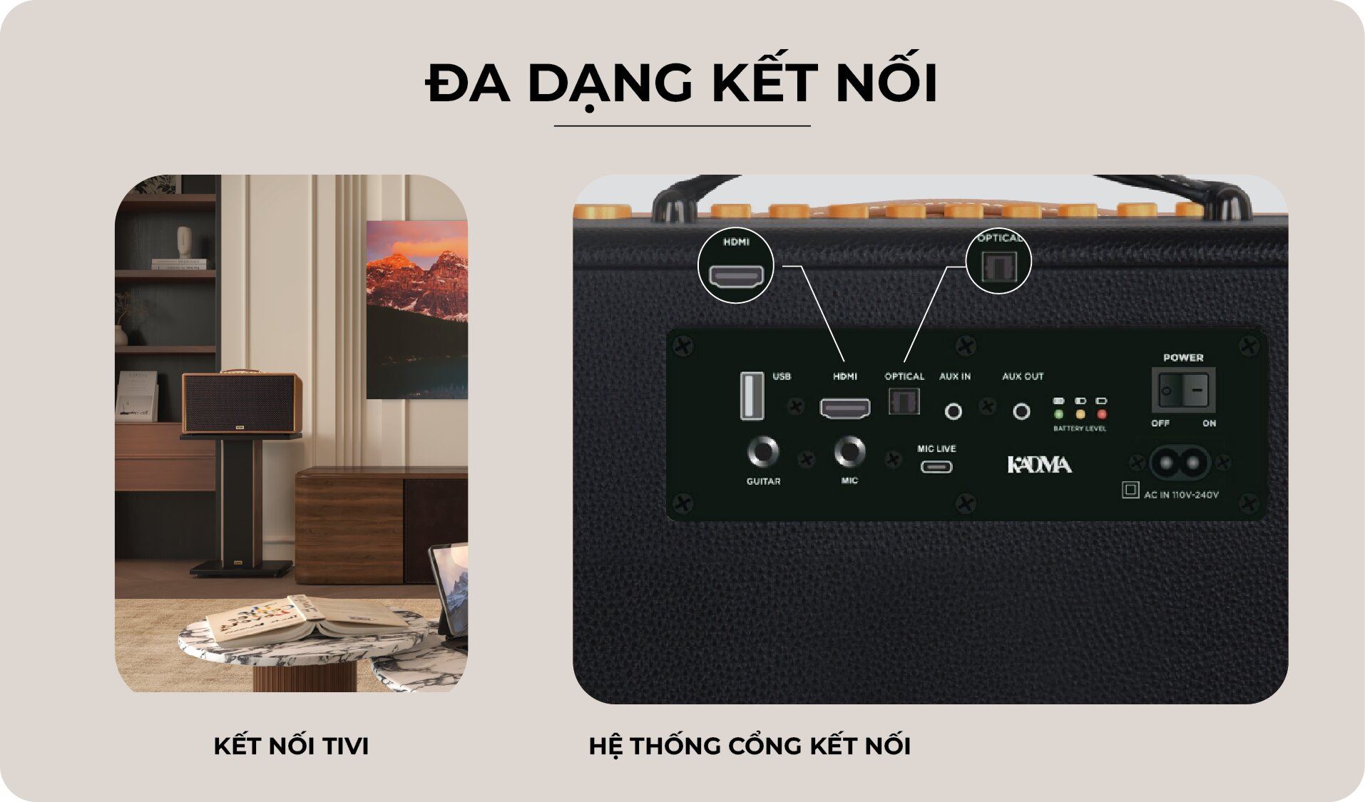Bên cạnh đó, loa còn hỗ trợ vô vàn cổng kết nối có dây phong phú như AUX 3.5mm (input/output), Headphone, Optical, HDMI ARC, OTG/Type C, USB, cùng hai cổng chuyên dụng Guitar Input 6.3 mm và Mic Input 6.3 mm cho chiếc loa này thành trung tâm giải trí đa phương tiện.