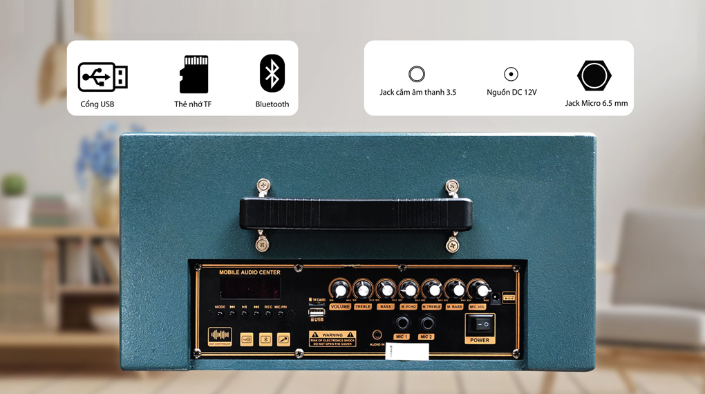 Mẫu loa Mobell này còn được thiết kế thêm nhiều cổng kết nối khác để thuận tiện cho việc truyền phát dữ liệu và xuất âm thanh như jack cắm âm thanh 3.5 mm, jack micro 6.5 mm, cổng USB và thẻ nhớ TF.