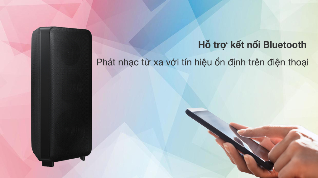 - Samsung MX-ST90B 1700W có kiểu dáng hiện đại với thiết kế 3 mặt loa được vát cạnh tinh xảo và sở hữu gam màu đen sang trọng, tạo điểm nhấn cho không gian giải trí. Ngoài ra, sản phẩm còn được trang bị bánh xe hỗ trợ người dùng di chuyển được thuận tiện.