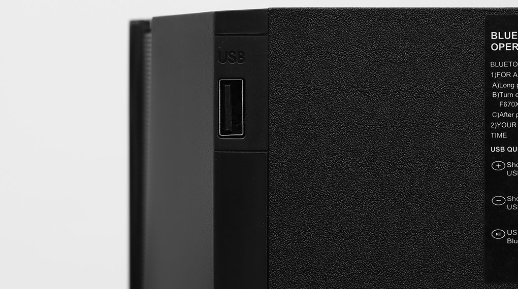 Phía cạnh bên loa được trang bị một cổng USB-A. Mặt sau của loa sub là nơi bố trí các cổng kết nối, gồm: Cổng Coaxial, nguồn ra âm thanh, nguồn vào âm thanh, nút bật/tắt loa và một dây nguồn. Cạnh bên cổng kết nối là Bass Reflex giúp cải thiện hiệu suất của loa trầm ở tần số thấp.
