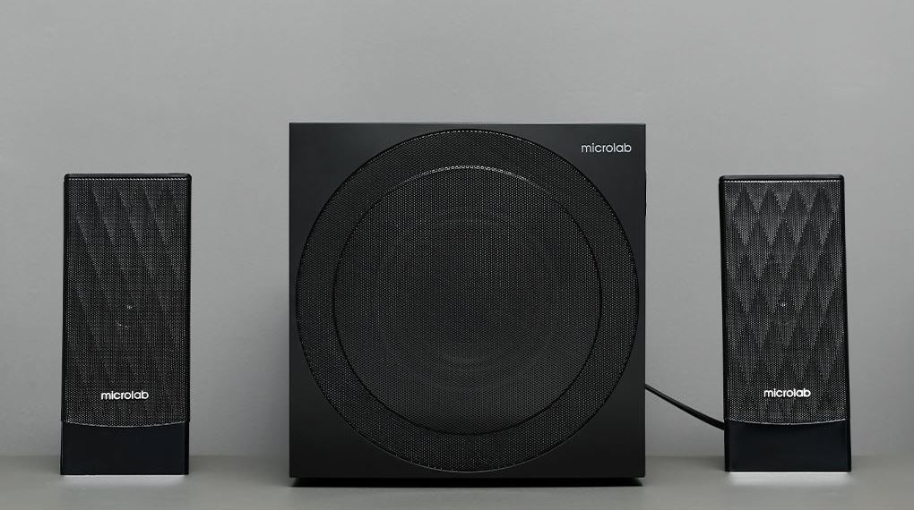 Bộ sản phẩm bao gồm một loa siêu sub trung tâm và hai loa vệ tinh, được bố trí đối xứng nhưng vẫn giữ được sự gọn gàng và thẩm mỹ. Phần loa sub được thiết kế vuông vức, chắc chắn, với mặt trước là lớp lưới lớn bao phủ gần như toàn bộ bề mặt. Logo “microlab” được đặt tinh tế ở góc phải phía trên, mang đến cảm giác chuyên nghiệp mà không gây rối mắt.