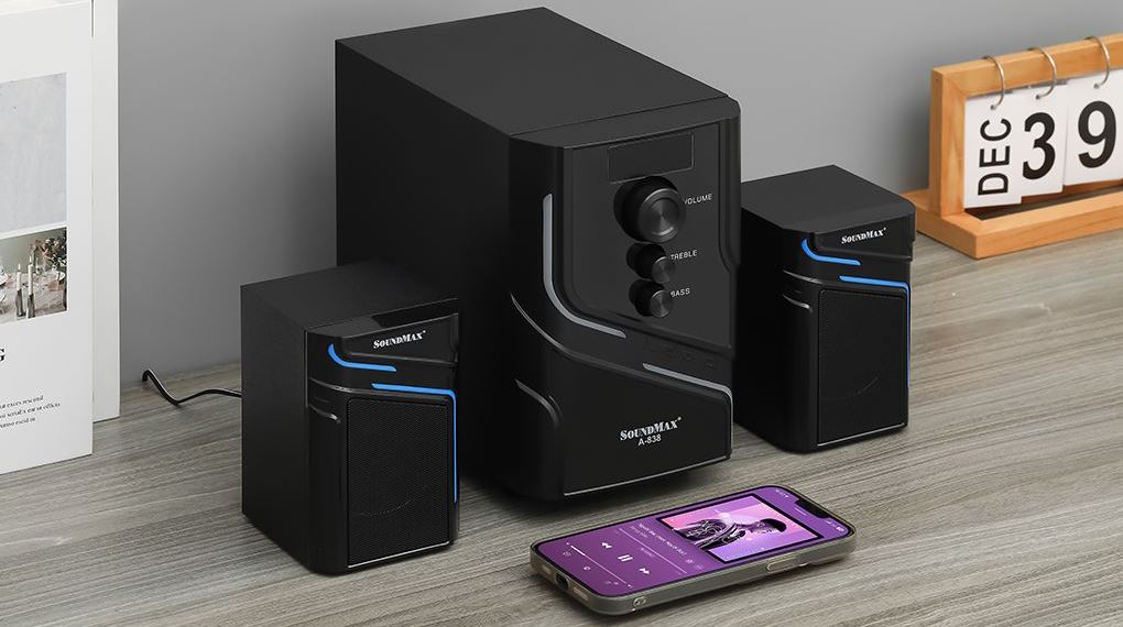 Với hệ thống loa 2.1 kênh và tổng công suất 20W, SoundMax A838/2.1 mang đến chất lượng âm thanh rõ nét và mạnh mẽ vượt mong đợi trong phân khúc. Loa subwoofer trung tâm đảm nhận nhiệm vụ tái tạo âm trầm sâu, chắc và có lực, giúp người nghe cảm nhận rõ từng nhịp bass trong các bản nhạc điện tử hay khi xem phim hành động.