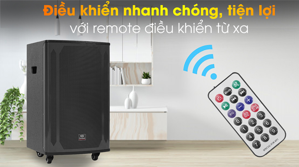 Ngoài việc sử dụng các nút điều khiển trên thân loa, người dùng có thể sử dụng remote để điều khiển từ xa các chức năng vốn có trên loa kéo.