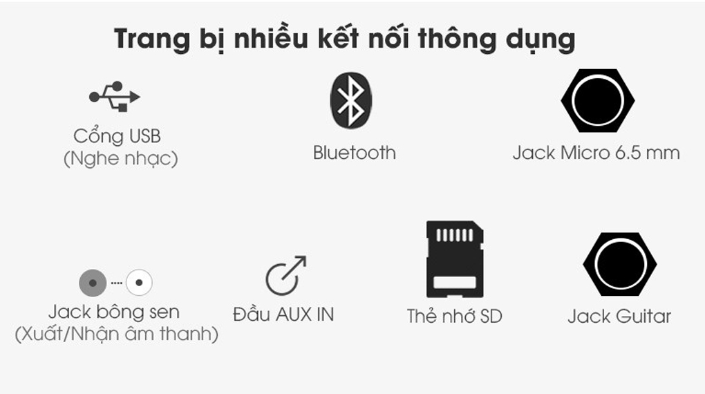 Để thuận tiện cho việc thưởng thức âm nhạc với chất lượng âm thanh mạnh mẽ và lôi cuốn, mẫu loa này còn được trang bị nhiều cổng kết nối khác như cổng USB, cổng Guitar, jack 6.5 Micro, jack bông sen trắng đỏ, thẻ nhớ SD và cổng đầu AUX IN, giúp người dùng có nhiều sự lựa chọn hơn khi kết nối loa với các thiết bị khác.