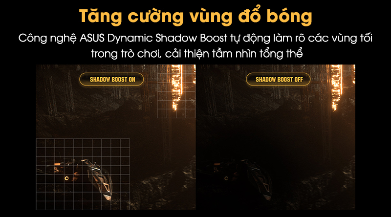 Công nghệ ASUS Shadow Boost giúp cân bằng độ sáng cho vùng tối của game cho trải nghiệm xem đã mắt.