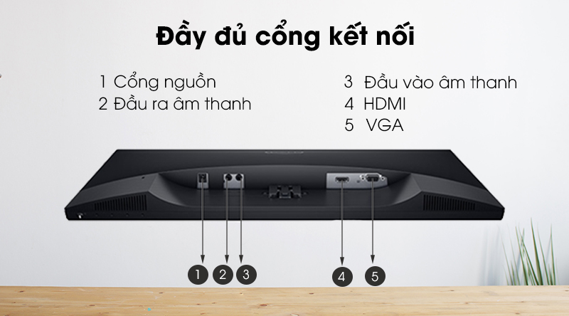 Màn hình máy tính được trang bị đầy đủ các cổng kết nối : HDMI 1.4, VGA, Audio Line-in, Audio Line-out giúp bạn thuận tiện để kết nối nhiều nguồn khác nhau như: Laptop, máy tính bàn…