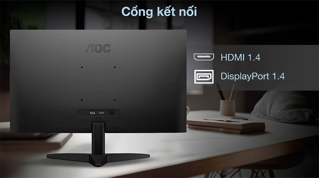 Màn hình AOC mang đến trải nghiệm làm việc hoặc giải trí ổn định nhờ thiết kế chân đế vững chắc. Chân đế này được làm từ vật liệu chất lượng cao giúp màn hình đứng vững trên mọi bề mặt và hạn chế tối đa rung lắc trong quá trình sử dụng. Các cổng kết nối như HDMI 1.4 và DisplayPort 1.4 được bố trí gọn gàng ở mặt sau, vừa tiết kiệm không gian vừa giúp bạn dễ dàng kết nối với các thiết bị khác.