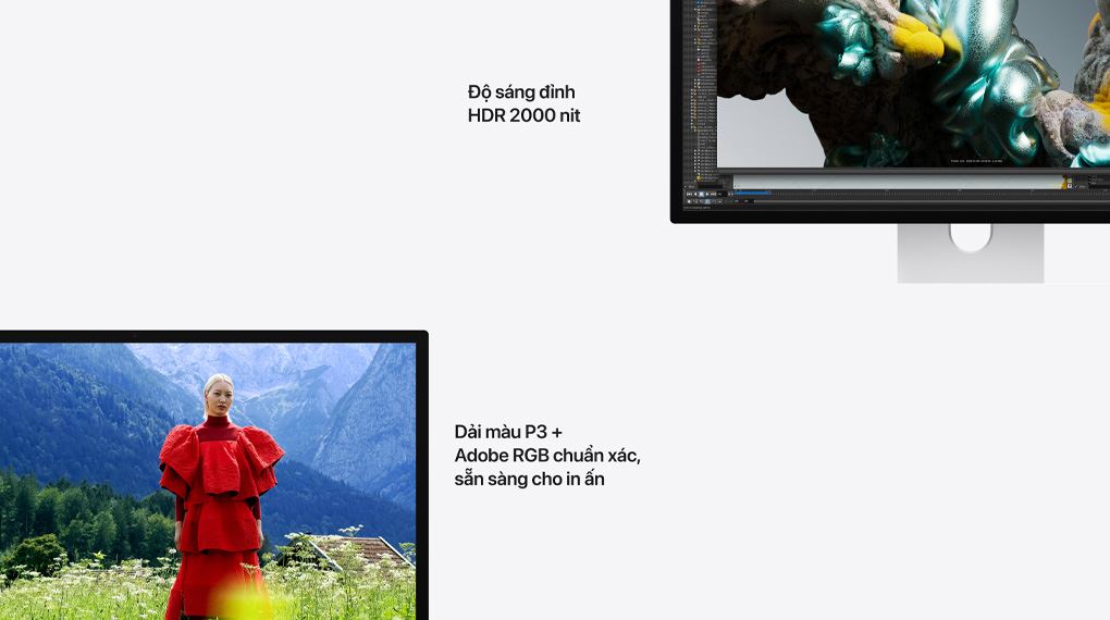Việc trang bị dải màu rộng P3 và Adobe RGB giúp tái tạo màu sắc chuẩn xác, đáp ứng yêu cầu cao từ công việc sáng tạo. Tốc độ làm mới 120 Hz hỗ trợ các chuyển động mượt mà, tối ưu hóa quá trình xử lý đồ họa chuyên sâu. Ngoài ra, độ sáng 2000 nits (HDR) của Studio Display mang lại sự sắc nét vượt trội, cho phép người dùng quan sát hình ảnh rõ ràng trong nhiều điều kiện môi trường làm việc khác nhau.