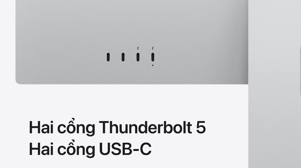 Studio Display XDR sở hữu khả năng kết nối linh hoạt với hai cổng Thunderbolt 5, hỗ trợ tốc độ truyền tải dữ liệu tới 120Gb/s. Một cổng Thunderbolt 5 hỗ trợ sạc thiết bị chính lên tới 140W, cổng còn lại phục vụ phụ kiện tốc độ cao hoặc thiết lập đa màn hình. Ngoài ra, màn hình Apple tích hợp thêm hai cổng USB Type-C với tốc độ 10Gb/s, tối ưu cho việc kết nối các thiết bị ngoại vi.