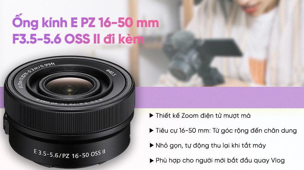 Điểm làm nên sự tiện lợi của bộ máy ảnh này chính là ống kính E PZ 16-50 mm F3.5-5.6 OSS II. Với thiết kế zoom điện tử mượt mà, bạn có thể thay đổi tiêu cự từ góc rộng 16 mm (để quay vlog nhóm, phong cảnh) đến tiêu cự chân dung 50 mm chỉ bằng một cái gạt cần.